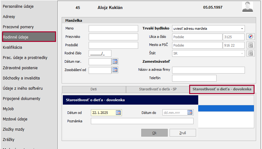 V Personalistike na karte Rodinné údaje zadáte na záložke Starostlivosť o dieťa – dovolenka, obdobie starostlivosti o dieťa. OLYMP automaticky zohľadní zamestnancovi vyšší nárok na dovolenku, na karte Mzdové údaje.