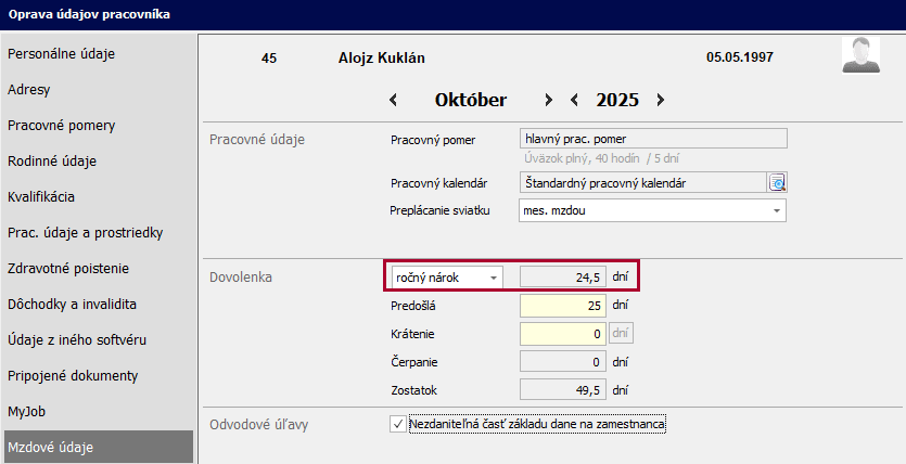 V prípade, že sa zamestnanec začne alebo prestane starať o dieťa v priebehu roka, program podľa zadaného dátumu pomerne prepočíta rozsah zvýšenej dovolenky. Prepočet nároku na dovolenku pri starostlivosti o dieťa je nastavený od roku 2022.