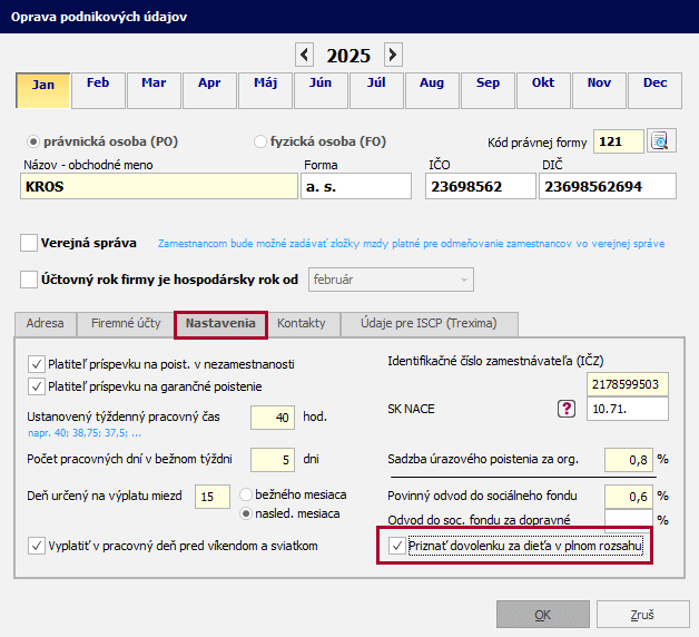 V prípade, že nechcete, aby program pomerne prepočítaval rozsah dovolenky podľa obdobia starostlivosti o dieťa v priebehu roka zadaného na karte Rodinné údaje, cez Organizácia – Podnik – Nastavenia – označte Priznať dovolenku za dieťa v plnom rozsahu.