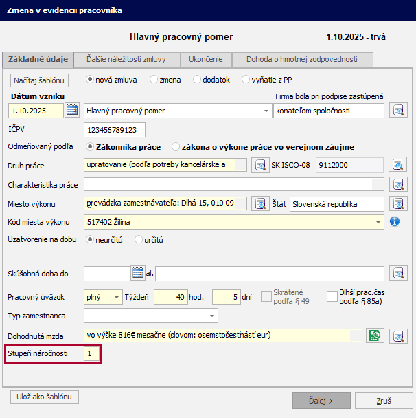Ak ste prijali nového zamestnanca, stupeň náročnosti práce je potrebné vyplniť pri zadávaní nového pracovného pomeru v Personalistike na karte Pracovné pomery.