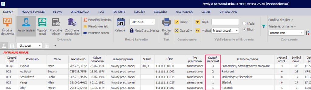 To do akého stupňa náročnosti práce je zamestnanec zaradený vidíte priamo v hlavnej evidencii Personalistika v stĺpci Stupeň náročnosti.