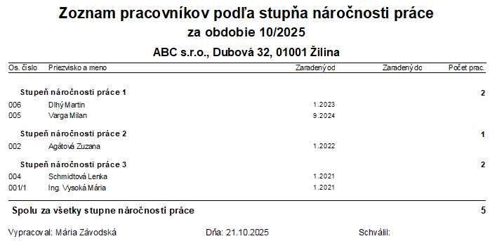 Prípadne si stupeň náročnosti práce overíte na dokumente Zoznam pracovníkov podľa stupňa náročnosti práce ( Tlač – Personalistika – Údaje o pracovníkoch – Zoznamy pracovníkov).
