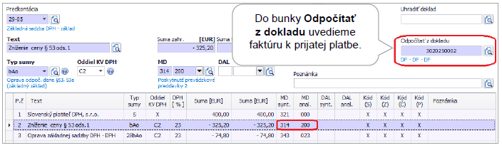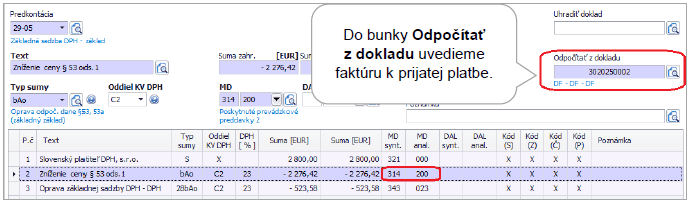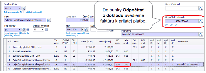 Faktúru zaúčtujeme v okruhu DF – Došlé faktúry pomocou automatického účtovania 24 – DF s prijatým preddavkom. V Rozpise DPH doplníme do bunky Preddavky hodnotu odpočítaného preddavku. Faktúru k prijatej platbe neúčtujeme na nákladový (obstarávací) účet, keďže nedošlo k dodávke tovaru/poskytnutí služby. Ten používame pri konečnej vyúčtovacej faktúre. Faktúra k prijatej platbe bude uvedená v daňovom priznaní k DPH a kontrolnom výkaze.