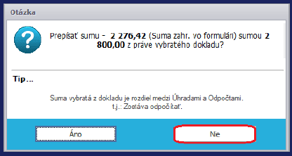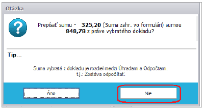 Pri výbere faktúry k prijatej platbe v bunke Odpočítať z dokladu sa zobrazí hláška, ktorú potvrdíme voľbou NIE.
