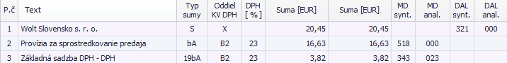 Reštaurácia, s.r.o., platiteľ DPH, využíva služby spoločnosti Wolt Slovensko s.r.o. (ďalej Wolt), platiteľa DPH, na prezentáciu svojich jedál a ich následný predaj zákazníkovi (fyzickým osobám). Zákazník si jedlo vyberie prostredníctvom aplikácie alebo webovej stránky. Za zvolené jedlo zaplatí bezhotovostne na bankový účet spoločnosti Wolt, ktorá mu v mene Reštaurácie, s.r.o. vystaví doklad o predaji. Doručenie jedla zabezpečuje kuriér spoločnosti Wolt. Pre názorné zobrazenie príkladu budeme vychádzať z predpokladu, že bol uskutočnený iba jeden predaj jedla v sume 56,80 eura s DPH. V dohodnutom intervale Wolt zašle Reštaurácii, s.r.o. výkaz o predaji a doklady vystavené zákazníkom za dané obdobie. Zároveň vystaví faktúru na províziu za sprostredkovanie predaja (20,45 eura s DPH 23%). Wolt vyplatí Reštaurácii, s.r.o. úhrady prijaté od zákazníkov znížené o províziu (tu 36,35 eura vrátane 19% DPH). Ako zaúčtuje Reštaurácia, s.r.o. dodanie jedla zákazníkovi a prijatú službu sprostredkovania?