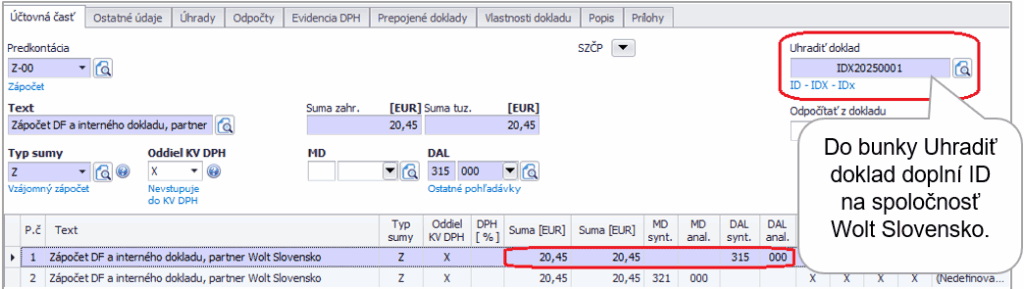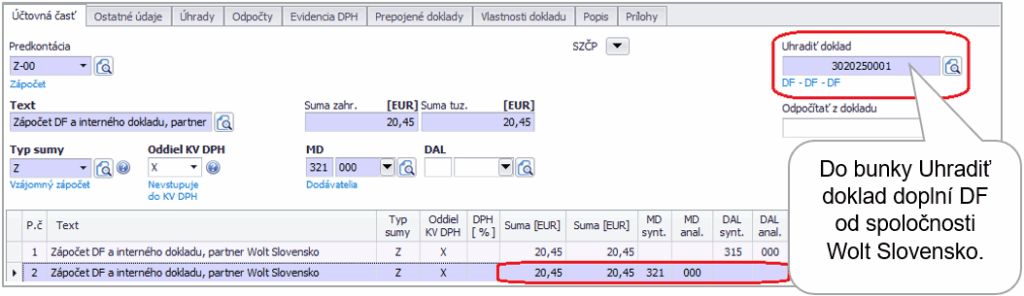 Zápočet došlej faktúry a interného dokladu zaúčtuje spoločnosť Reštaurácia, s.r.o. v okruhu interných dokladov pomocou automatického účtovania Z ID – Zápočet. Predmetné doklady sa započítajú v rovnakej sume, t. j. 20,45 eura.