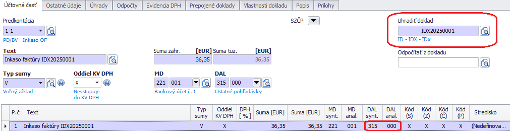 Zvyšnú sumu interného dokladu, t. j. 36,35 eura, prijala spoločnosť Reštaurácia, s.r.o. na svoj bankový účet. V programe Podvojné účtovníctvo OMEGA zaúčtuje príjem peňažných prostriedkov v okruhu bankových výpisov pomocou automatického účtovania 1 PD/BV – Inkaso OF, DD.