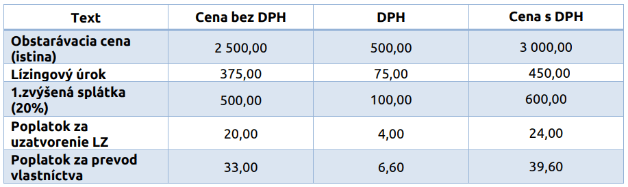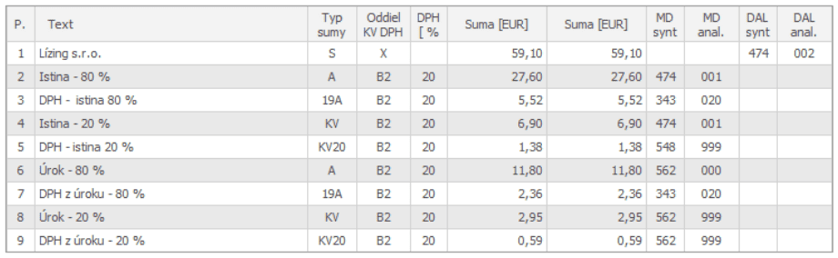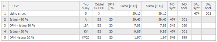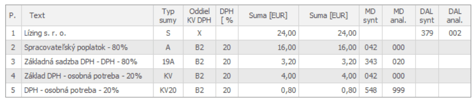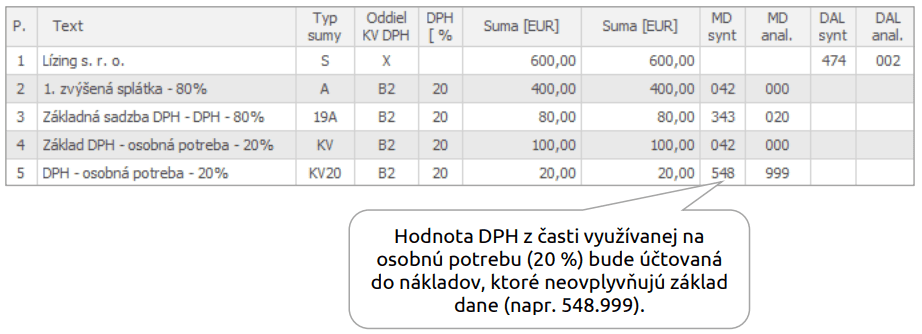 V nasledujúcom príklade je zobrazený jeden zo spôsobov, ako evidovať lízing v prípade majetku, ktorý je využívaný aj na osobnú potrebu.