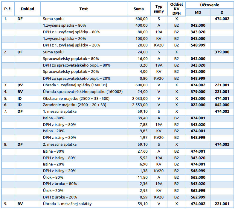 V prvej mesačnej splátke účtujeme iba o istine (o úroku zatiaľ nie), môžeme použiť automatické účtovanie 20/80DF – Výdavky osobnej potreby.