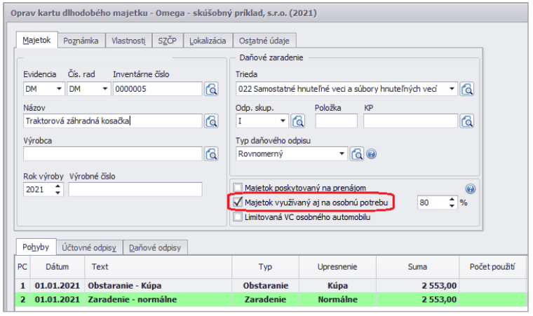 Na karte majetku, ktorý je využívaný na osobnú potrebu, je nutné zapnúť voľbu Majetok využívaný aj na osobnú potrebu a nastaviť percento. Po zapnutí tejto voľby sa krátenie daňového odpisu do daňových výdavkov vykoná prostredníctvom pripočítateľnej položky k základu dane v DPPO.