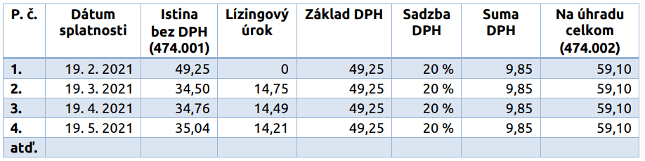 Súčasťou lízingovej zmluvy je splátkový kalendár s predpismi splátok: