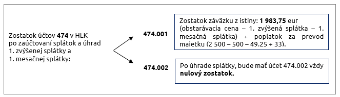 Pre prehľadnejšiu evidenciu budeme preto používať účet 474.001 pre účtovanie postupného znižovania záväzku z istiny (obstarávacej ceny) a účet 474.002, pre evidovanie jednotlivých predpisov splátok a ich úhrad.