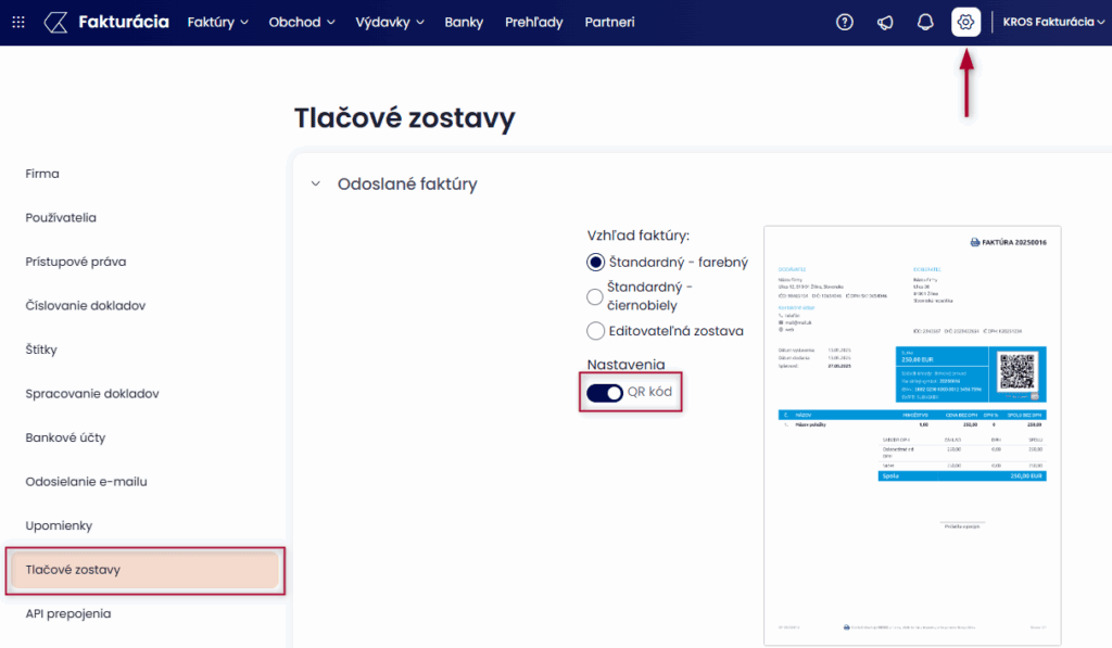 Cez Nastavenia si zvoľte v časti Tlačové zostavy Štandardný – farebný, Štandardný – čiernobiely vzhľad Vašich faktúr, či zálohových faktúr, alebo si v rámci platených balíkov PRO a FLEXI nastavte vlastný vzhľad faktúr pomocou Editovateľnej zostavy. Ako pracovať s editovateľnou zostavou si môžete prečítať v našom návode.