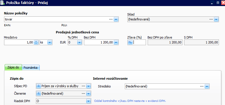 - percento DPH je 0%, stĺpec PD vyberte Príjem za tovar a Riadok DPH je O.