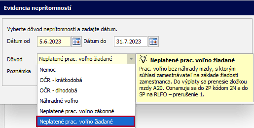Pri zostave Profesionál/Biznis/Profi zadáte pracovné voľno v Personalistike konkrétneho zamestnanca na karte Evidencia neprítomnosti. Vyplníte Dátum od. Ak viete dátum ukončenia, uvediete aj Dátum do a vyberiete Dôvod neprítomnosti. Následne, po vygenerovaní mzdy, program vybranú neprítomnosť automaticky prenesie do mzdy zamestnanca.