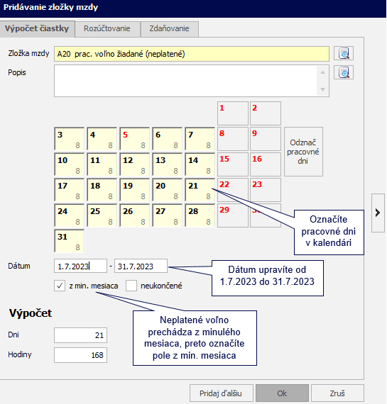 Pracovné voľno (bez náhrady mzdy) zadáte zložkou mzdy A 20 – prac. voľno žiadané (neplatené).