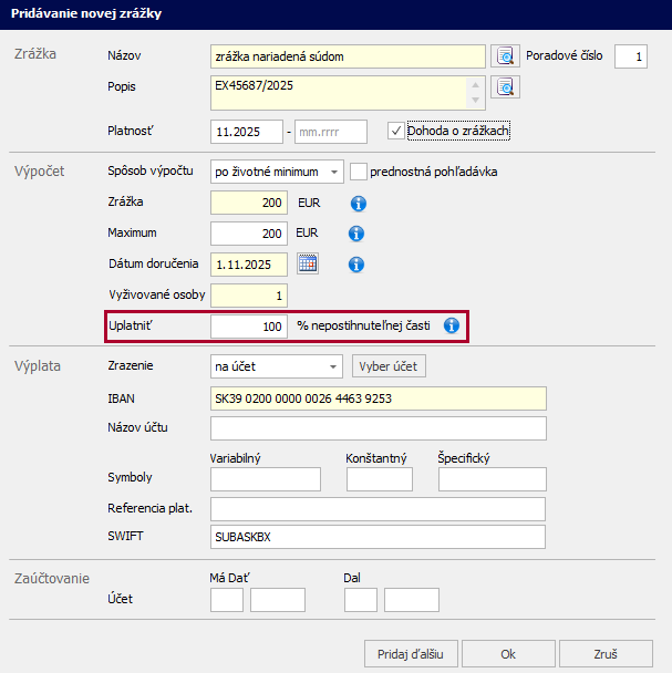 Ak má zamestnanec viac platiteľov mzdy, exekútor môže každému z nich osobitne určiť, akú časť nepostihnuteľnej sumy použiť pri výpočte exekúcie. V tomto prípade môžete v poli Uplatniť % nepostihnuteľnej časti zaevidovať, aká časť nepostihnuteľnej sumy v % má byť použitá pri výpočte exekúcie.