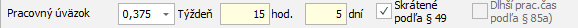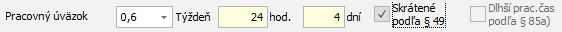 Úväzok môžete zadať aj lomkou. Týždenný počet hodín podelíte ustanoveným týždenným pracovným časom. V tomto prípade 24/40. Program automaticky prepočíta koeficient 0,6 a 24 hodín. Doplníte 4 dni a označíte voľbu Skrátené podľa § 49.