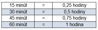 Potrebujete do výplaty zadať zložku mzdy na štvrť/pol hodinu? V programe zadávame časový údaj v hodinách. Keďže jedna hodina má 60 minút tak napr. 15 minút je 15 min : 60 min = 0,25 hodiny. Týmto spôsobom môžeme prepočítať akékoľvek minúty na hodiny.