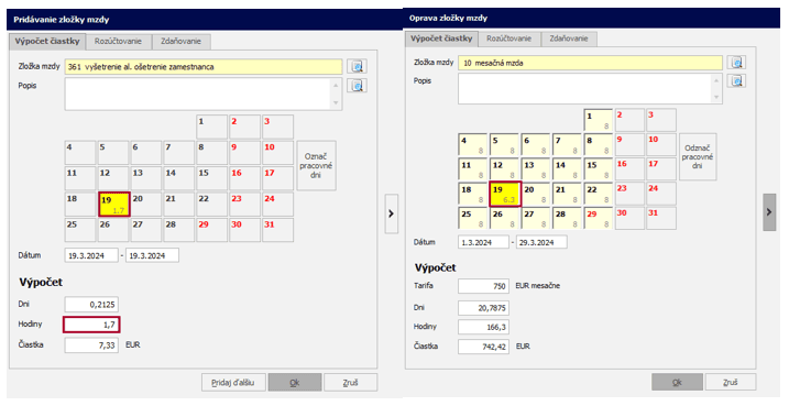 Návštevu lekára zadáte zložkou mzdy 361 – vyšetrenie al. ošetrenie zamestnanca. Prepočítajte minúty na hodiny 42 min : 60 min = 0,7 hodiny. Zamestnanec bol teda u lekára 1,7 hodiny. V zložke mzdy 361 – vyšetrenie al. ošetrenie zamestnanca kliknite pravým tlačidlom myši na 19. 3. 2024 a vpíšete počet hodín. Program automaticky poníži počet hodín na základnej zložke mzdy.