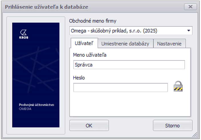 Pri prvom spustení programu OMEGA sa zobrazí okno prihlásenie užívateľa k databáze. Na začiatku nám program ponúkne prihlásenie do databázy Omega – skúšobný príklad, ktorý je cvičnou databázou prístupnou pre každého užívateľa programu. V tejto databáze si môžeme simulovať rôzne funkčnosti a prípady, ktoré nechceme zadávať do svojej „živej“ databázy. Prihlasovacie meno do skúšobného príkladu je vždy Správca, bez hesla. Prihlásenie potvrdíme tlačidlom OK.