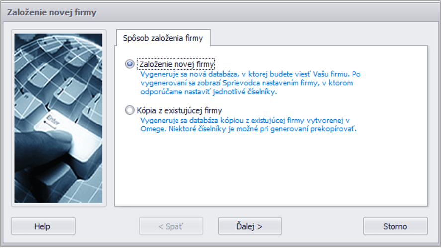Ak chceme založiť vlastnú firmu, urobíme tak cez záložku Firma – Nová. Zobrazí sa okno kde je možné vybrať spôsob založenia firmy, a to buď ako nová firma, alebo ako kópia z existujúcej firmy. Pri výbere kópie si program vytvorí kópiu z existujúcej firmy, čím môžeme prevziať jednotlivé číselníky, ako sú napr. nastavenia, partneri, účtovný rozvrh a pod.