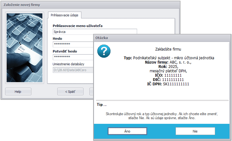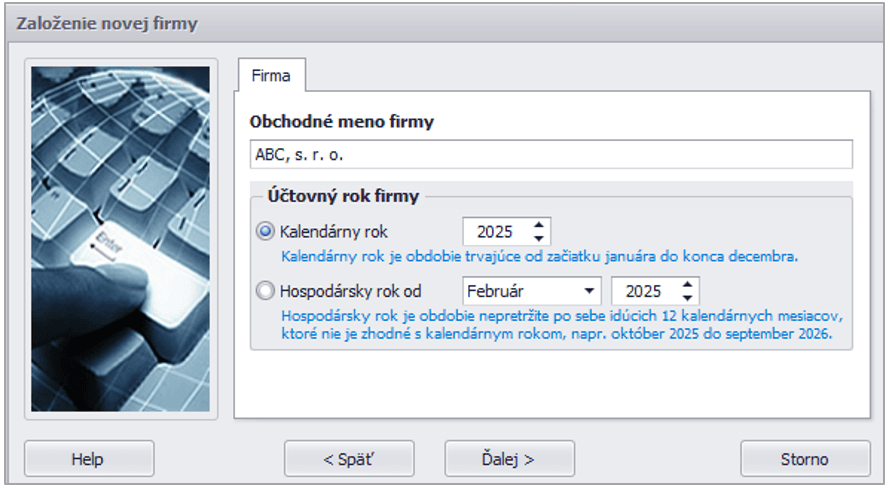 Po výbere jednej z týchto možností sa zobrazí formulár, v ktorom je potrebné si vyplniť názov novej firmy a účtovný rok – či už kalendárny alebo hospodársky.