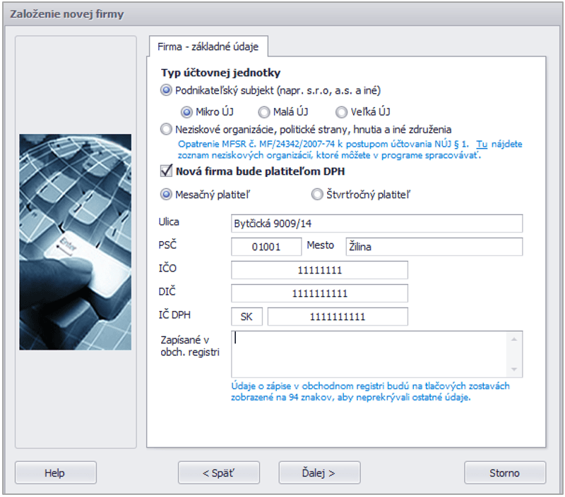 Vo formulári firemné údaje doplníme údaje o firme. Napr. zapísané v obch. registri, kontaktné údaje, zodpovednú osobu, právnu formu, SK NACE a pod. Tieto údaje budú využívané na viacerých miestach programu (napríklad sa budú preberať do dokladov fakturácie, daňové priznanie a pod.).