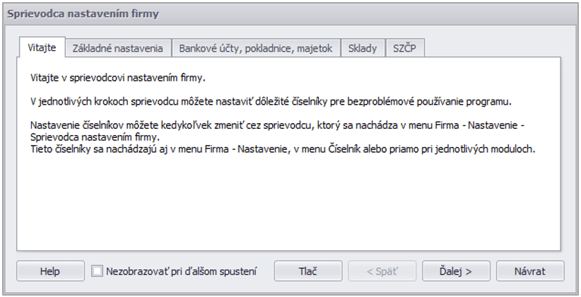 Pri prvotnom otvorení novozaloženej firmy sa nám zobrazí sprievodca nastavením firmy. V jednotlivých krokoch sprievodcu môžeme nastaviť dôležité číselníky pre bezproblémové používanie programu ako sú všeobecné nastavenia, firemné údaje, účtovný rozvrh, bankové účty a pokladnice a taktiež nastavenie skladov.