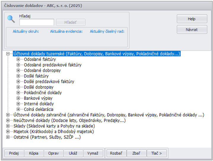 Číslovanie dokladov slúži na nastavenie číslovania dokladov účtovníctva, skladov a pomocných evidencií. Vo formulári sa nachádza rozbaľovací strom, ktorý má štyri základné logické úrovne: skupiny, okruhy, evidencie a číselné rady. Číslovanie dokladov je pre viaceré číselné rady prednastavené autormi programu. Môžeme si ho upraviť podľa našich potrieb, príp. doplniť ďalšie vyhovujúce evidencie alebo číselné rady.