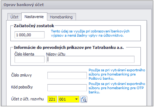 Na začiatku účtovania v programe je ešte potrebné zadať evidenčný zostatok pre pokladnice a bankové účty (účtovný zostatok zaevidujeme neskôr interným dokladom alebo cez účtovný rozvrh). Evidenčný zostatok a analytický účet zadáme pri pridávaní bankového účtu v záložke Nastavenie.