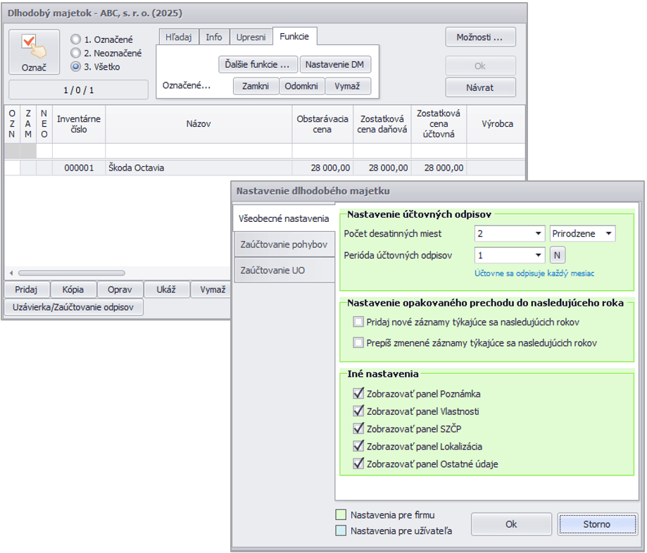 V dlhodobom majetku nastavíme periódu účtovných odpisov, spôsob zaúčtovania odpisov a pohybov majetku.