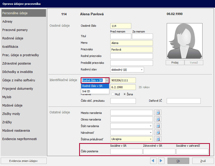 Po zadaní inej štátnej príslušnosti ako je slovenská sa sprístupní Číslo poistenia – Sociálne v SR, Zdravotné v SR a Sociálne v zahraničí. Tieto polia vyplníte, ak zamestnanec cudzinec nemá pridelené Rodné číslo v SR a Sociálna a zdravotná poisťovňa mu pridelí vlastné číslo poistenia v SR.