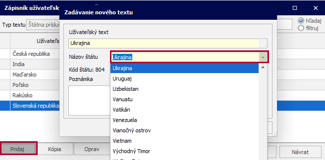 V časti Ostatné údaje zaevidujete Štátnu príslušnosť. Ak sa v číselníku nenachádza, pridáte novú štátnu príslušnosť cez lupu na konci riadku Štátna príslušnosť.