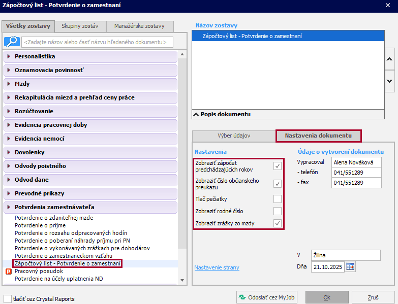Pred tlačou je možné v nastavení dokumentu označiť, či sa má zobraziť zápočet predchádzajúcich rokov, rodné číslo, zrážky zo mzdy a tlačiť pečiatka.