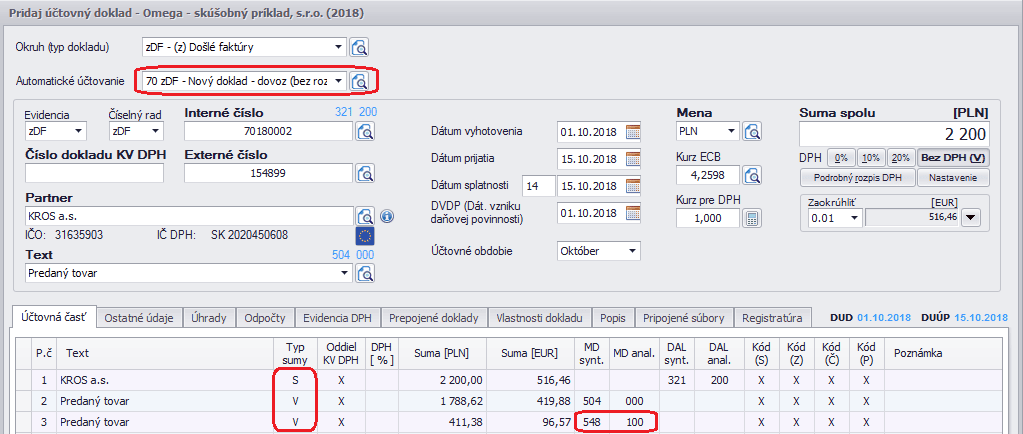 Zaúčtujeme došlú faktúru z Poľska, s hodnotou 2 200 PLN s 23% sadzbou DPH (sadzba v Poľsku je 23%). Po zaúčtovaní faktúry je potrebné upraviť typy súm na V – Voľný základ a účet pre DPH. Takto upravený doklad nevstúpi do výkazu DPH.