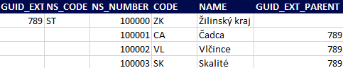 - GUID_EXT_PARENT – údaj sa neimportuje, slúži len na určenie nadradenej položky v stromovej štruktúre podľa hodnoty GUID_EXT. Importovanú položku zaradíme pod príslušné interné rozúčtovanie. Ak nie je vyplnený, položka sa považuje za hlavnú úroveň.