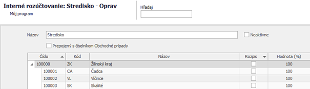 - V záložke Hromadné funkcie v číselníku interného rozúčtovania, do ktorého sa dostaneme cez nastavenie interného rozúčtovania na doklade alebo na položke dokladu cez tri bodky.