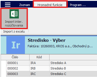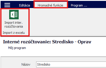 Do hromadných funkcií v nastaveniach Interného rozúčtovania je možné importovať Interné rozúčtovanie z Excelu.