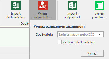 Ak je potrebné vymazať iba jedného partnera, môžeme ho vybrať zadaním názvu alebo podľa IČO. V prípade, že chceme odstrániť všetkých zadaných dodávateľov, označíme voľbu Všetkých dodávateľov.