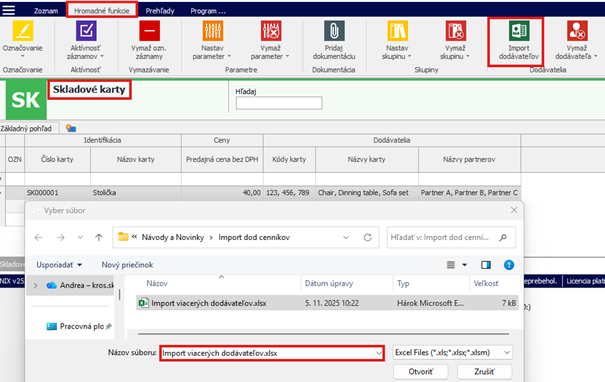 Do hromadných funkcií nad evidenciou skladových kariet pribudla nová sekcia Dodávatelia, v ktorej je podporený Import dodávateľov. Okrem pridávania dodávateľov je podporená aj funkčnosť úpravy cenníkov.