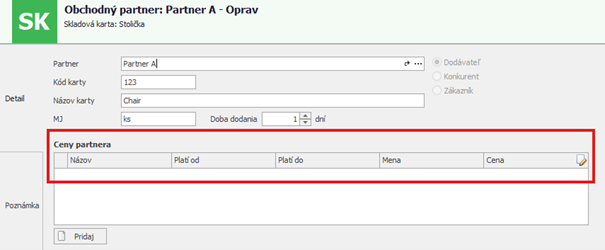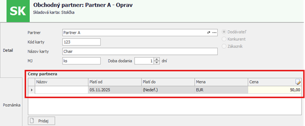 - Ak už existuje cenník pre vybraného dodávateľa, systém aktualizuje ceny v dodávateľskom cenníku priradenom tomuto partnerovi.
