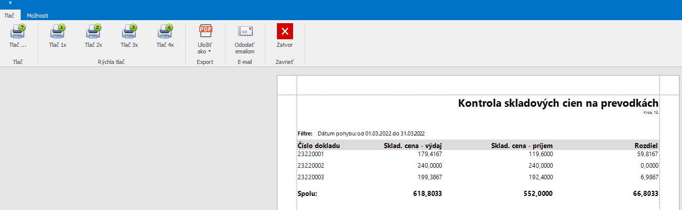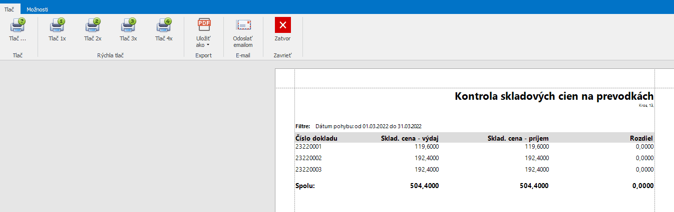 Keď máme filtre správne nastavené ideme si pozrieť tlačový výstup Kontrola skladových cien na prevodkách cez tlačidlo Tlač.