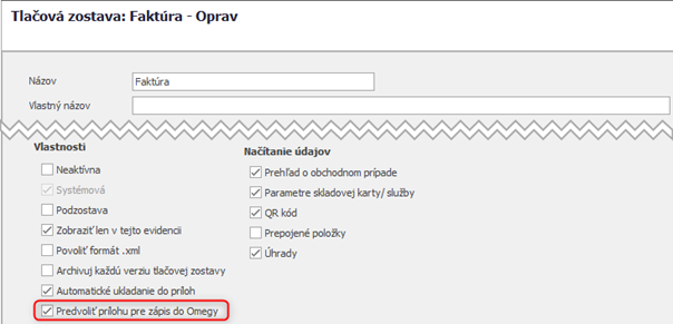Dvojklikom na tlačovú zostavu s názvom Faktúra sa nám zobrazí nastavenie tlačovej zostavy. V tomto formulári si zaškrtneme možnosť Predvoliť prílohu pre zápis do Omegy a potvrdíme nastavenie cez ľavé horné tlačidlo OK.