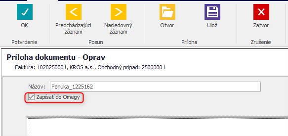 Pri nákupných dokladoch, ktoré nám zasielajú dodávatelia je možné nastaviť, aby každá príloha nahratá do dokumentácie dokladu mala automaticky zakliknutý príznak Zapísať do Omegy. V tomto prípade nás prosím kontaktujte na našom HOTLINE alebo prostredníctvom e-mailu servis.onix@kros.sk, aby sme vám toto nastavenie zapli priamo v obchodnom cykle.