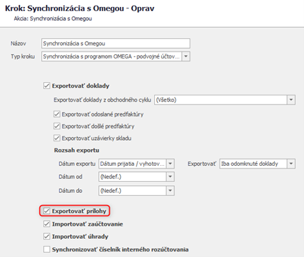 Pre využívanie prenosu príloh do EUD je potrebné nastaviť si v programe prílohy, ktoré sa majú zapísať do Omegy. Ďalším krokom je úprava akcie synchronizácie tak, aby sa s dokladmi prenášali aj prílohy z dokladu zo záložky Dokumentácia.