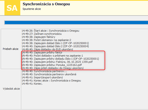 Po vykonaní týchto nastavení sa počas synchronizácie budú zapisovať s dokladmi aj prílohy do evidencie účtovných dokladov v Omege. To, že sa nám prílohy zapisujú, vidíme v priebehu akcie.