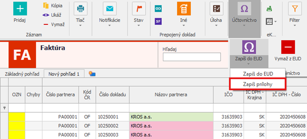 Po kliknutí na konkrétny doklad sa nám zobrazí v hornej časti nové tlačidlo v sekcii Účtovníctvo, a to Zapíš prílohy. Týmto tlačidlom zapíšeme do programu Omega len jeho prílohy.