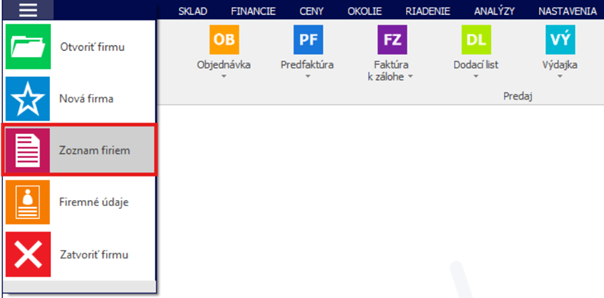 Po spustení ERP systému ONIX klikneme na ľavé horné menu – tri čiarky a následne klikneme na Zoznam firiem.