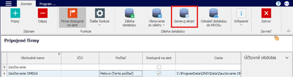 Po rozkliknutí sa nám zobrazí zoznam firiem. Klikneme na tlačidlo „Generuj skript“ (skript sa bude generovať nad firmou, ktorú máme označenú v zozname).